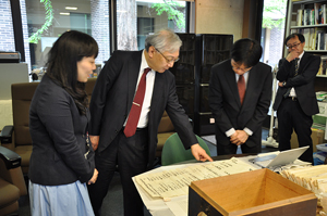 小松文部科学審議官が、去る2017年5月17日に人間文化研究機構総合地球環境学研究所(地球研・安成哲三所長)を訪問した。安成所長から、地域から世界まで、地球環境に関する広範な課題解決に貢献している地球研の取組について説明があった後、所内の視察を行い、自然科学系と人文・社会科学系の学際融合研究の取組事例として、「気候適応史プロジェクト」のプロジェクトリーダー中塚武教授からプロジェクトの概要説明、鎌谷上級研究員から江戸時代の「本堅田共有文書」を用いた研究手法を含むプロジェクトの説明を行った。