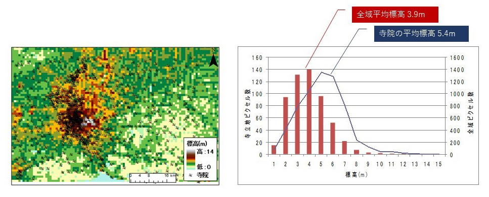 ■ 寺院を建立する標高の社会的閾値も約1.5m