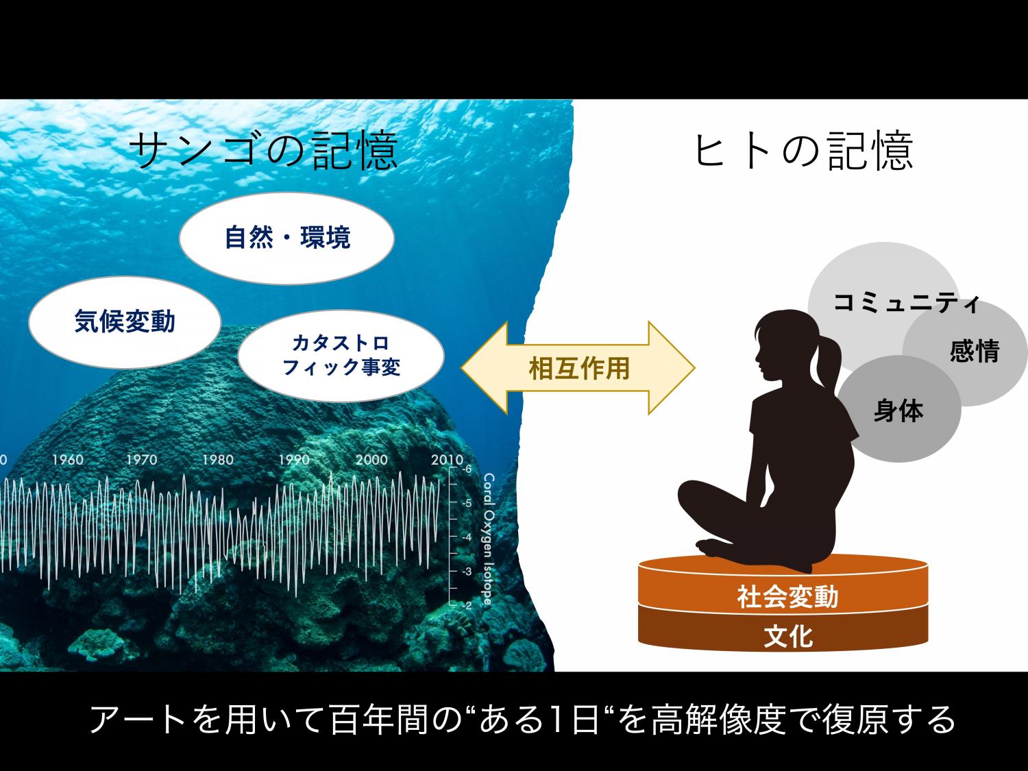地球環境変動は、気候・地理区分と海洋・陸上の生態系の分布に大きく関わるとともに、人の移動や定住、文明の盛衰、生活様式など、私たち人間の社会にも強く影響してきました。その過程には外的、内的な要因により維持された知(在来知)が存在し、現代の我々が将来起こりうる未曾有の環境変動を乗り越えるにあたり選択肢となり得ます。しかし、近年の経済発展や人口増加、グローバリゼーションによる生活様式の一元化によって、在来知が失われ、社会は気候変化や環境事変に対してさらに脆弱になるかもしれません。この研究では、サンゴ骨格年輪を中心とした高解像度の環境復原と、地域のステークホルダーの記憶や現代の我々の心情や行動をもとに、自然(サンゴ)の記憶と人の記憶を重ね合わせることによって、人と自然の関係の高解像度データを導出することを発想しました。その科学的なデータを、アートを媒介とすることによって異分野の研究者や地域のステークホルダーと共有し、地域における在来知を再評価します。さらに将来の地球環境変動に対してレジリエントであり、共感を得やすい地域社会像を得るための未来集合知を創造することを目指しています。