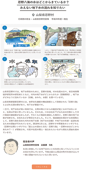 研究は、福井県大野市、愛媛県西条市、岩手県上閉伊郡大槌町、山梨県南都留郡忍野村、兵庫県千種川流域、滋賀県野洲川流域、フィリピン国シラン・サンタローザ川流域でおこないました。各調査地において、環境トレーサビリティー手法を用いた研究の成果を紹介するシンポジウムを開催し、有効性を問うアンケート調査をおこないました。その結果、環境トレーサビリティー手法を、調査地における環境問題の解決のために有効と判断したステークホルダーのタイプについて、複数の調査地間に共通して次の3つの特徴がみられました。それは、「調査地における環境保全の対象(地下水や川)と、普段から関わりがある人」、「環境トレーサビリティー手法で得られる情報に対して、普段から関心が高い人」、「シンポジウムで研究者によって説明される環境トレーサビリティー手法についての理解度が高い人」でした。