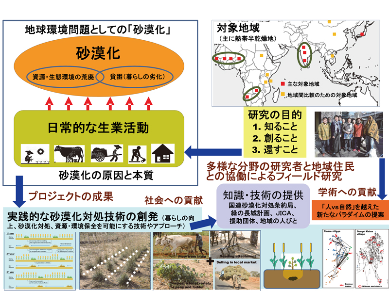 アフリカやアジアの半乾燥地は、資源・生態環境の荒廃と貧困問題が複雑に絡み合う砂漠化の最前線といわれます。私たちは、これらの地域の風土への理解を深めながら、現地の人びとともに、暮らしの安定や生計の向上につながり、同時に環境保全や砂漠化抑制が可能となるようなアプローチを探りました。その成果として、砂漠化対処に向けて、「ヒトVS自然」ではなく「ヒトも自然も」という発想転換といくつかの技術をもたらしました。