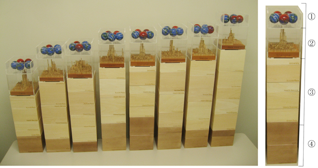 18のメガシティ(下線の都市は左から順に模型と対応)カイロ・ジャカルタ・東京・デリー・上海・ダッカ・マニラ・ニューヨーク・大阪神戸・ソウル・コルカタ・ムンバイ・カラチ・モスクワ・メキシコシティ、サンパウロ、ブエノスアイレス・ロサンゼルス)を対象に、持続可能な都市を探るための模型を作製。模型は①~④の4つの部分によって構成されている。①の部分は、地球環境への負荷、社会的負荷について、重大な負荷をかけていると5指標(一人当たりのCO2排出量・一人当たりの淡水消費量・大気中の水銀濃度・粒子状物質濃度(大気汚染)・経済的格差)と対応する地球儀が赤くなっている。地球儀がひとつでも赤い都市は、持続可能(地球の友達)であるとはいえない。②は各都市の人口密度分布を立体的に示している。③、④は都市からの恩恵にかかわる社会・経済の両側面の性能を、7指標(一人当たりの廃棄物量・緑地率・100万人当たりの大学数・10万人当たりの自殺者数・1000人当たりの医師数・一人当たりのGDPを国内その他都市の平均値と比較した比率・通勤や物流などの費用)によって示している。各指標(筒)が高いほど性能が高い