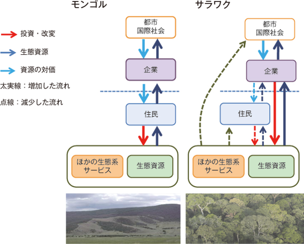 上に述べたモンゴルとサラワクの環境問題が、どのような原因で起こっているのか比較してみると、生態系利用における住民と企業の関係に、生態資源(自然の生態系から得られる資源)の性質に起因する重要な違いがあることがわかりました(図)。モンゴルでは、地元住民がまず草を生態資源として使用し、その製品(主にカシミヤなど)を企業に売ります。したがって、住民と企業はお互いに依存しています。一方で、サラワクの森林の場合は、企業が生態資源の利用に直接携わっており、森林を狩猟などにより利用している地元住民と森林伐採をする企業とは、同じ資源をめぐる競合関係にあります。このような環境問題が起こるメカニズムの違いに応じて、問題解決に有効な政策も異なることが明らかになりました。