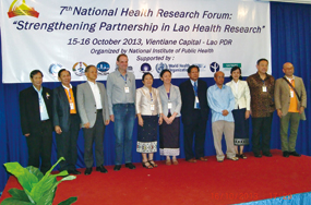 2013年10月に、第7回ラオス国家保健研究フォーラムを首都ビエンチャンで開催しました。そのなかで、「すべての人が、適切な健康増進、予防、治療、機能回復に関するサービスを、支払い可能な費用で受けられる」ことをめざす、ユニバーサル・ヘルス・カバレッジ(UHC: Universal Health Coverage)について、住民登録の重要性が話題となり、本プロジェクトもかかわった地域住民の動向を継続的に把握する「健康と人口の動態追跡調査システム(HDSS)」の方法や活用、拡大について議論されました。また、外務省・駐ラオス日本大使館の援助による官民草の根事業により、サワンナケート県セポン郡に「セポン村落保健ボランティアVHV研修センター」が設置され、ボランティアや保健センタースタッフ、郡スタッフの研修が開始されました。これら一連の取り組みによる長年の貢献を称え、ラオス政府よりラオス友好メダルを授与されました。今後、ラオス政府、NPO法人アジア保健教育基金、ラオス保健研究日本コンソーシアムなどと連携し、エコヘルスに重点ををおいた保健人材育成を行ない、ラオスの保健状況の改善につなげていく予定です。