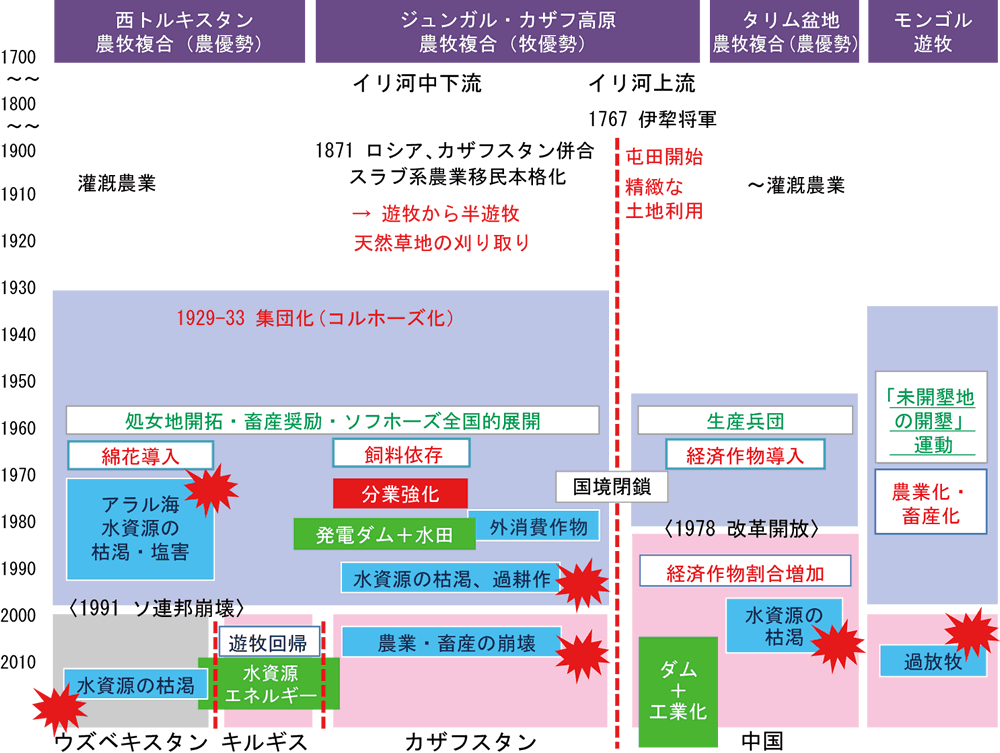18世紀後半以降、ロシアと清の進出と明確な国境によって地域は分断され、それぞれ異なる道を歩み始めます。近代化のなかで生じた環境問題も、生態環境と開発過程、ガバナンスの違いにより多様でした。