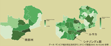 食料安全保障のためのレジリアンス指標を計測し、州行政区(左)と郡行政区(右)に地図化した。これらの地図は、どの地域がレジリアンス強化のためのホットスポットなのかを政策決定者が認識し、地域開発政策の優先度を決めるための有用な情報を提供する