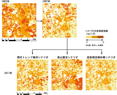 花粉を媒介するハナバチの種の多様度の変化(1962年と1997年)およびシナリオ別に予測した2017年の状況を示しています。多様なハナバチの生息には里山復活シナリオが最適であることがわかります