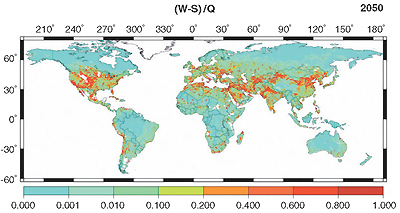 この図に示されているのは「2050年に、それぞれの地域で使用している水の量」を「2050年に、それぞれの地域で使用可能な水の量」で割った値である。この値が大きいところ(黄色や赤色のところ)は、水をほとんど使い果たすと予想されるところであり、いわゆる世界水危機の「ホットスポット」の候補地である