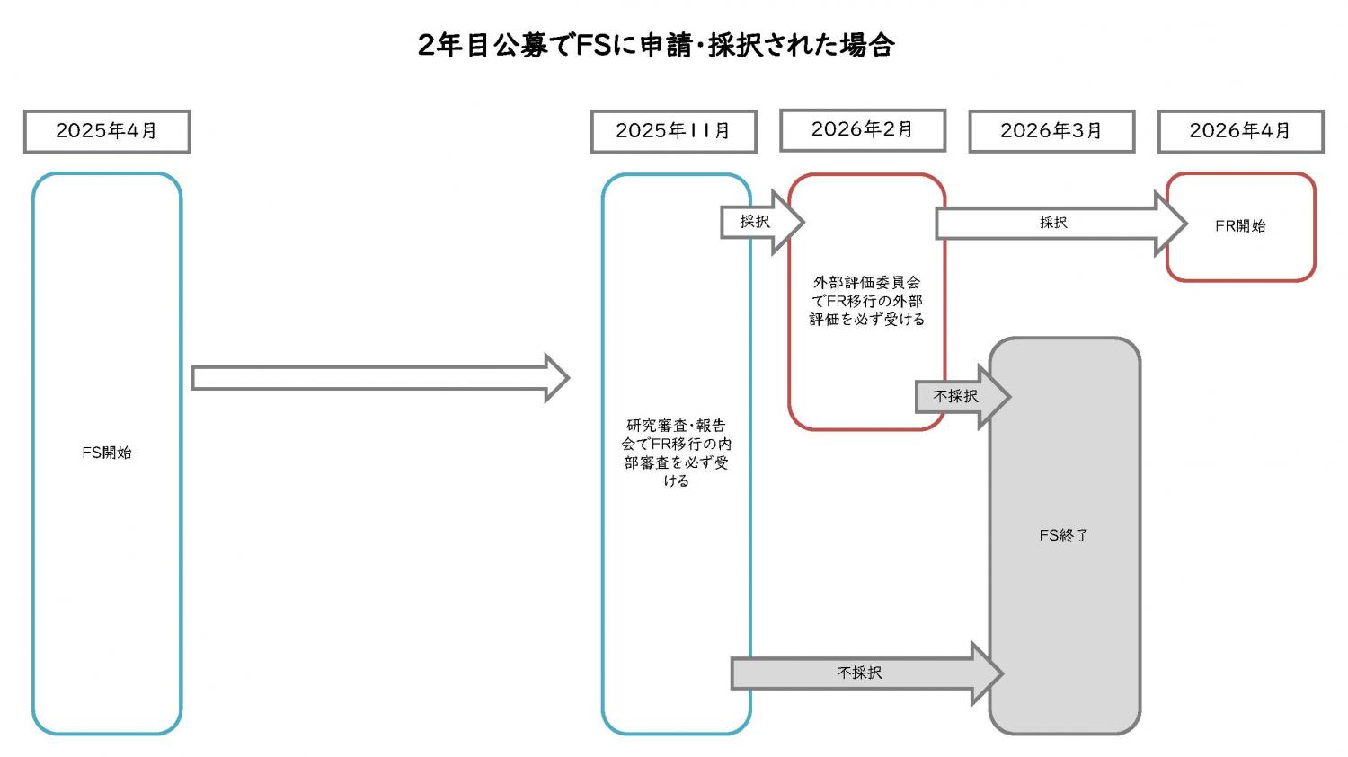 採択された場合、4月からFSを開始し、11月末にはFR移行の内部審査を受けていただきます。内部審査で採択され、年明けの外部評価を経て所内の選考で採択されると、翌4月からFRを開始できます。