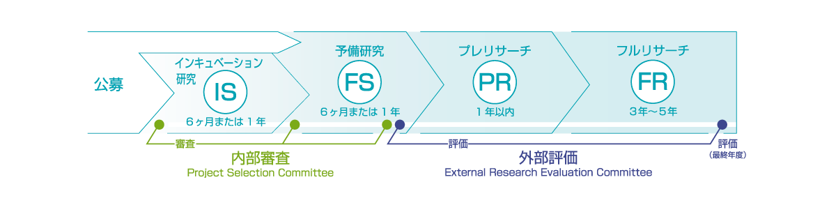 2年目公募では、プログラム期間の制約上、ISから開始する研究提案の公募はなく、FSから開始する研究提案のみ公募を行います。FS段階からの研究提案は開始後約半年でFR移行の内部審査を受ける必要があるため、プログラムの内容を十分に理解いただいている必要があります。