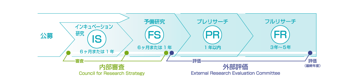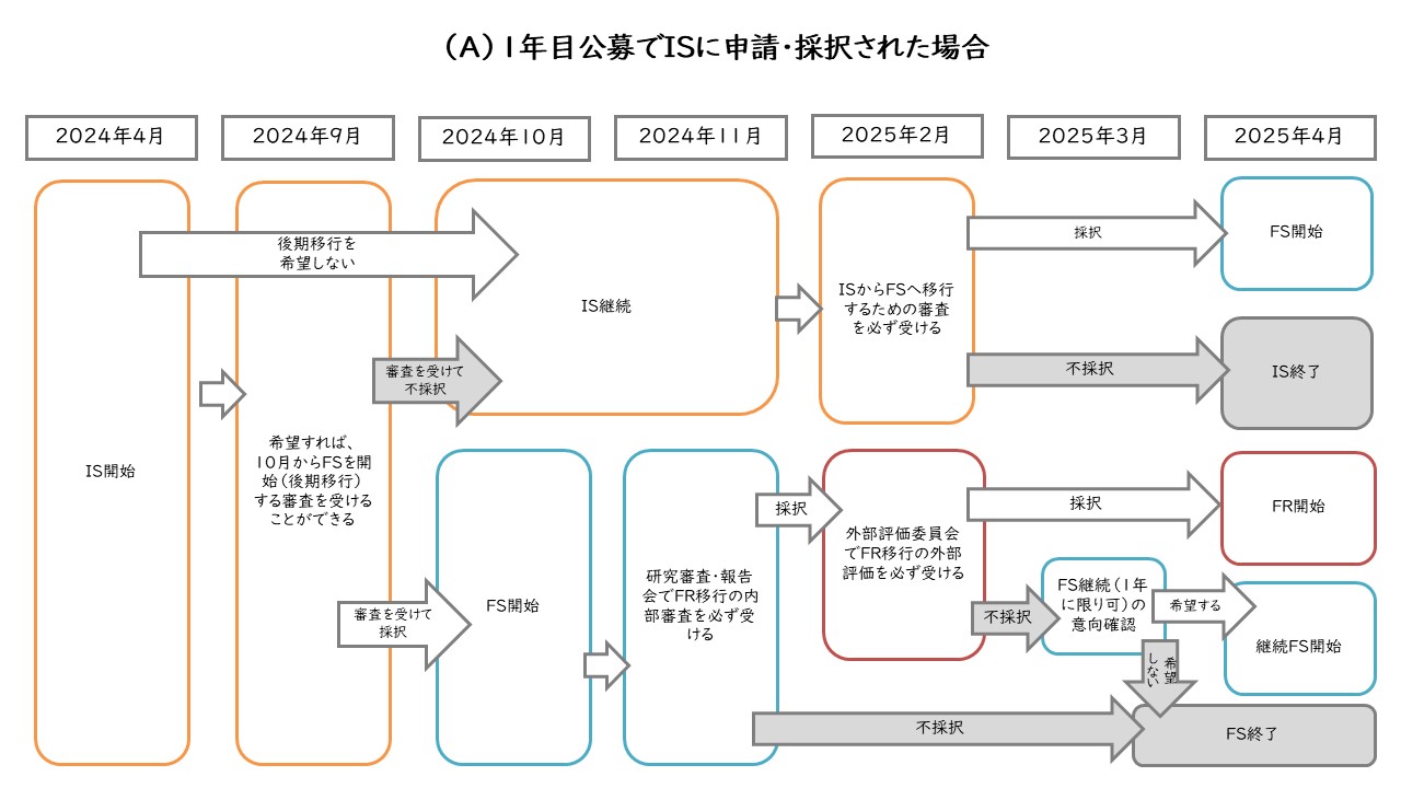 1年目公募では、ISから開始する研究提案とFSから開始する研究提案の2種公募を行っています。FS段階からの研究提案は開始後約半年でFR移行の内部審査を受ける必要があるため、プログラムの内容を十分に理解いただいている必要があります。