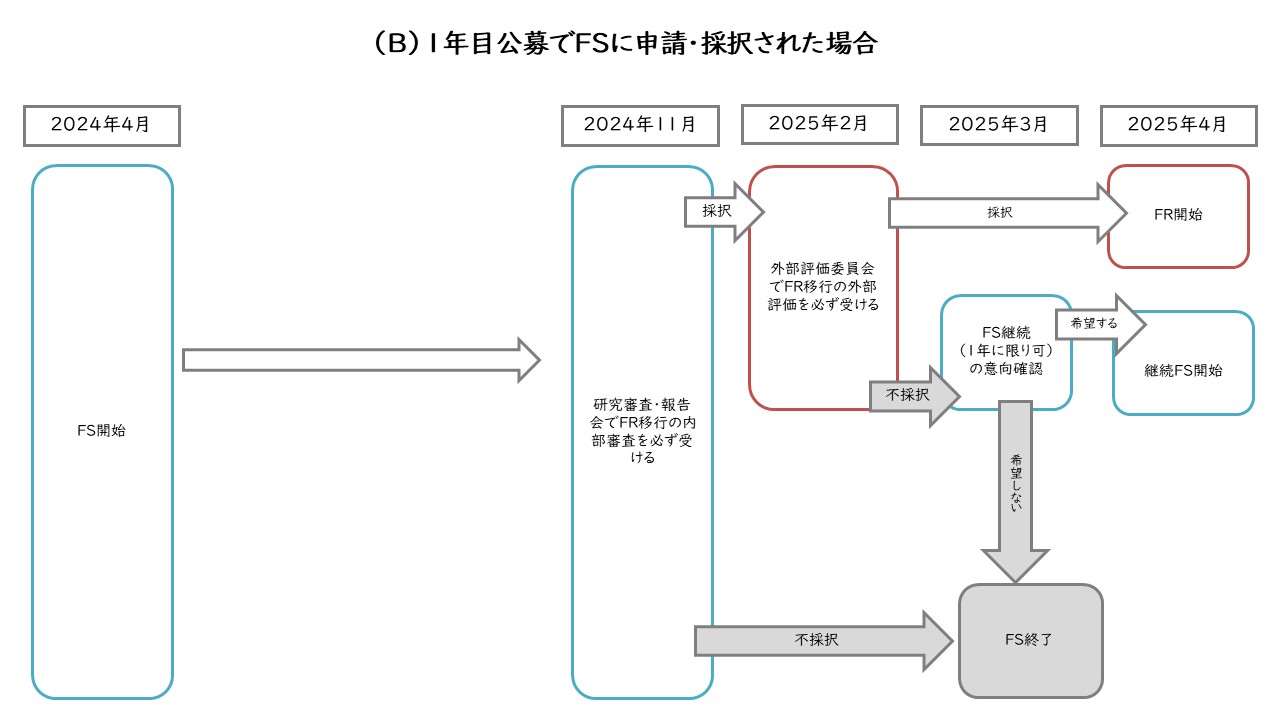 4月からFSを開始し、11月末にはFR移行の内部審査を受けていただきます。内部審査で採択され、年明けの外部評価を経て所内の選考で採択されると、翌4月からFRを開始できます。(B)と異なり、内部審査で採択され、外部評価を経て不採択となった場合であっても、プログラム期間の制約上、年度末でFSは終了となります。