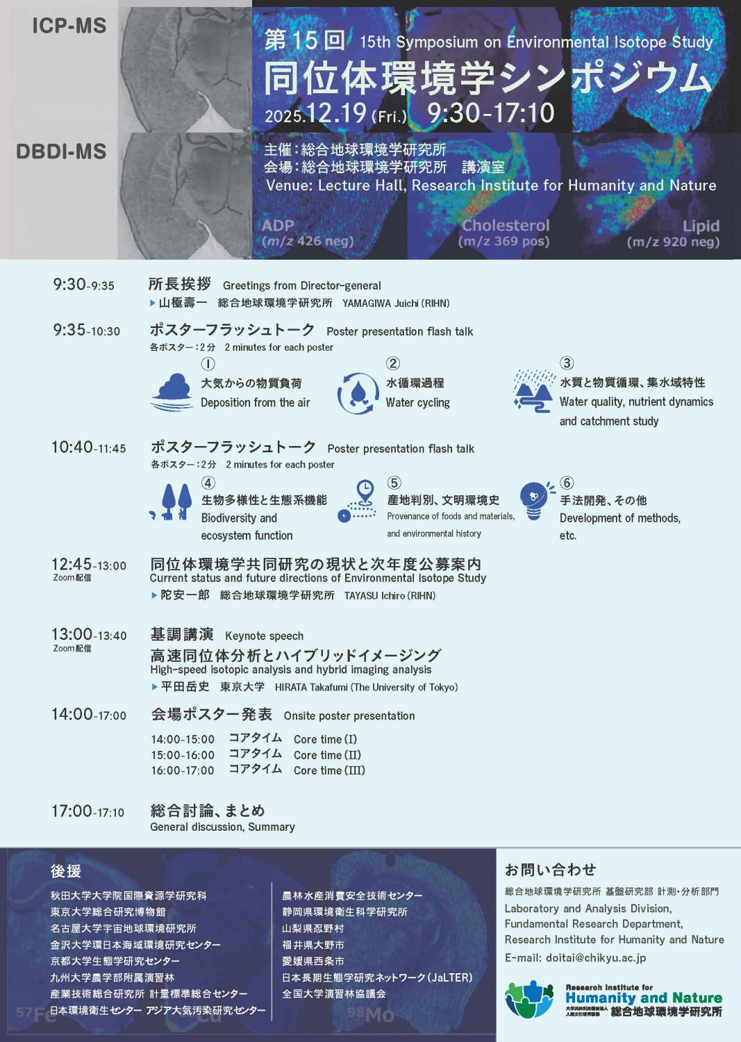 | プログラム | 9:00 開場 9:30 所長あいさつ 9:35ポスターフラッシュトーク (1)大気からの物質負荷 (2)水循環過程 (3)水質と物質循環、集水域特性 10:40ポスターフラッシュトーク (4)生物多様性と生態系機能 (5)産地判別、文明環境史 (6)手法開発、その他 11:50- 昼食休憩 12:45-13:00 同位体環境学共同研究の現状と次年度公募案内 Current status and future directions of Environmental Isotope Study 陀安 一郎(総合地球環境学研究所) Zoom配信 13:00-13:40 基調講演 高速同位体分析とハイブリッドイメージング High-speed isotopic analysis and hybrid imaging analysis 平田 岳史 氏(東京大学) Zoom配信 14:00-17:00ポスター発表(各班60分) 14:00-15:00 コアタイムⅠ 15:00-16:00 コアタイムⅡ 16:00-17:00 コアタイムⅢ 17:00-17:10 総合討論、まとめ |