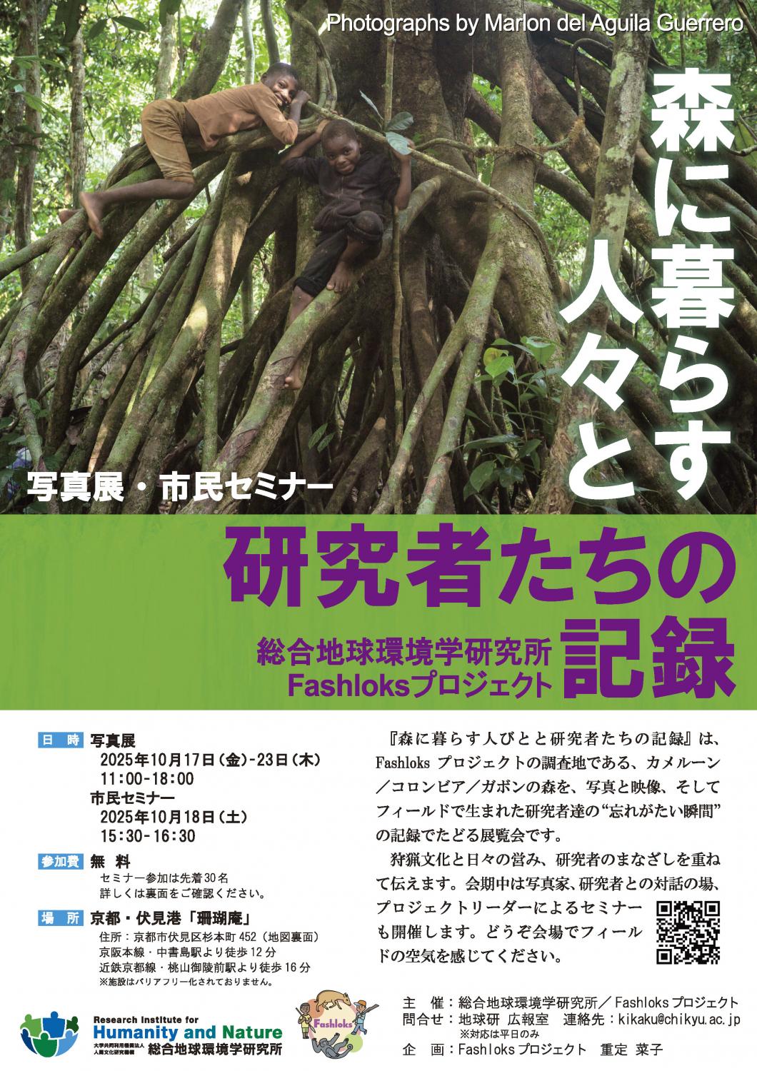 Fashloks プロジェクトの調査地である、カメルーン/コロンビア/ガボンの森を、写真と映像、そしてフィールドで生まれた研究者達の“忘れがたい瞬間”の記録をたどる展覧会です。