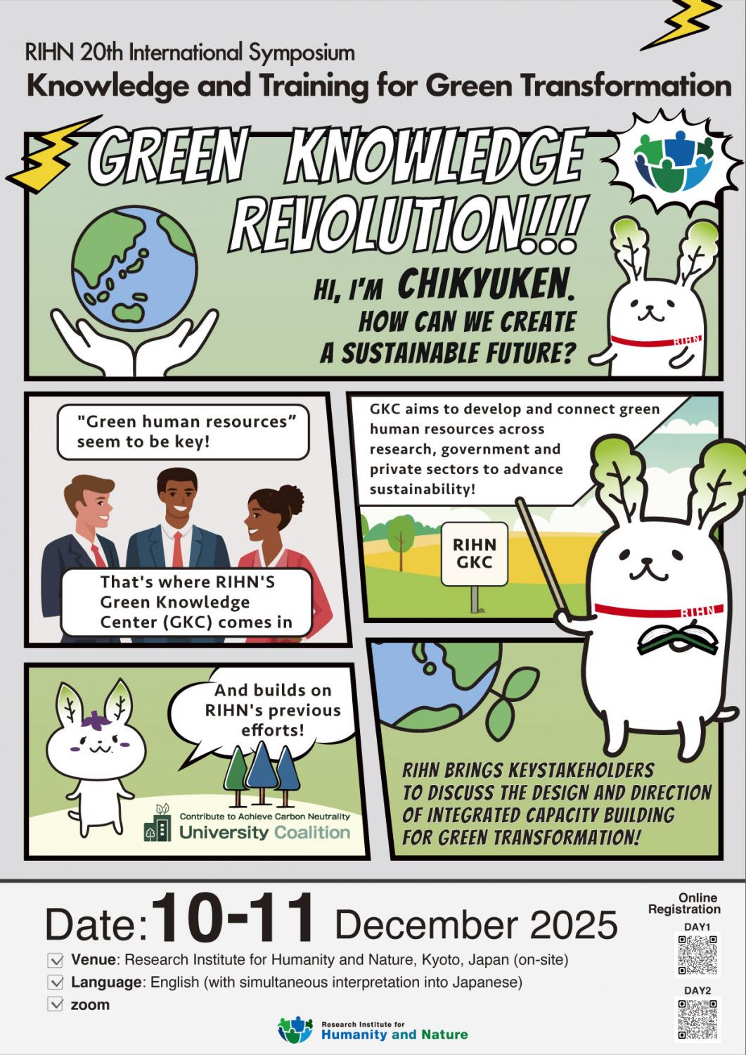 | 概要 | 持続可能な社会の実現には、新たな人間の知識と職場スキルが求められますが、日常的な「グリーン人材」の定義、教育、スキル向上、そして主流化は、まだ初期段階にあります。総合地球環境学研究所(地球研)の新たな取り組みであるグリーンナレッジセンター(GKC)は、研究、政府、民間セクターの間でグリーン人材の能力を創出・連携させることを目的に設立されました。これは、地域からグローバルに至る持続可能性の転換を支援するためのものです。 GKCは、地球研内の教育部門、上廣環境日本学センター、フューチャー・アースセンターによるこれまでの取り組みをさらに発展させるものであり、毎年開催されるTERRAスクールや、「カーボンニュートラル達成に貢献する大学等コアリション」(日本)での人材育成・国際連携に関するワーキンググループなども含まれます。 これらの取り組みは、国内外におけるグリーン・トランスフォーメーションを対象としており、地域、国家、国際レベルでの協働的な関与と発展が求められています。 第20回総合地球環境学研究所国際シンポジウムでは、グリーン・トランスフォーメーションの実現に向けた人材育成の設計、方向性、拡充について、主要な関係者が議論を交わすためのフォーラムが開催されます。 |