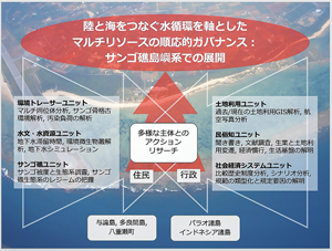 1)多様な主体とのアクションリサーチに加えて(写真1)、2)各種の安定同位体や環境トレーサー、メタゲノム解析法を用いて島嶼の水資源・水循環系を解析・可視化し、3)サンゴ礁(海洋)生態系との相互作用を明らかにします。また、4)GIS 手法を用いた土地利用の変遷の研究とあわせて、水資源の利用や管理に関する文化・規範・制度の変遷について、民俗学・社会科学的アプローチによって明らかにしたいと考えています。これらをとおして、5)サンゴ礁島嶼系の陸と海をつなぐ水循環を軸とした複数の資源(マルチリソース)の持続可能な順応的ガバナンスのあり方を探究し、具体的な取り組みや政策提言へつなげたいと考えています(図1)。