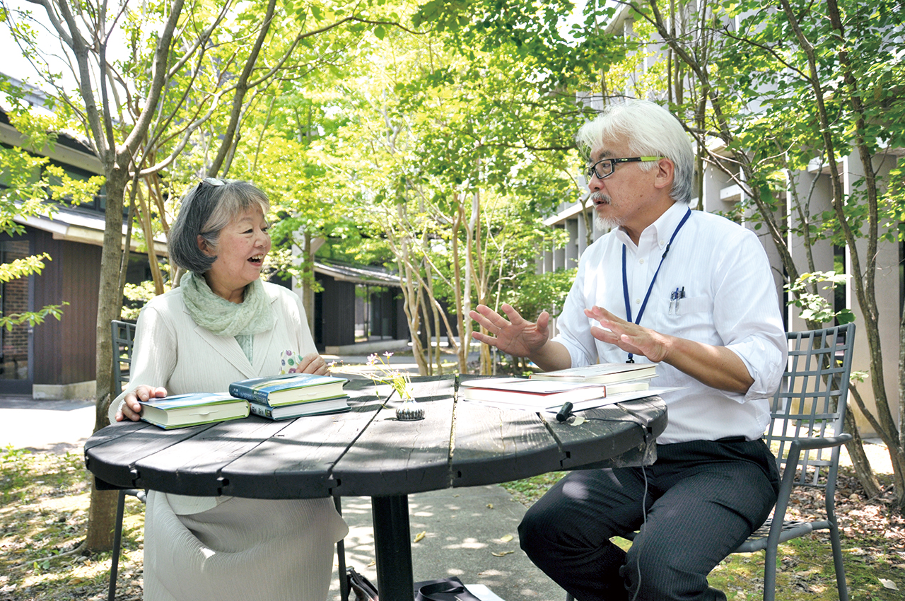 森さんとの対談は、阿部さんたっての希望で、こもれびあふれる地球研の中庭で実現した。鳥のさえずりをBGMに、二人が織りなす時間は絶妙の間感でゆったりと流れてゆく