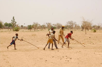 砂漠じゃないよ。ここ一面、トウジンビエっていう主食や、ササゲっていう豆、それにオクラなどをつくる畑なんだよ。 |