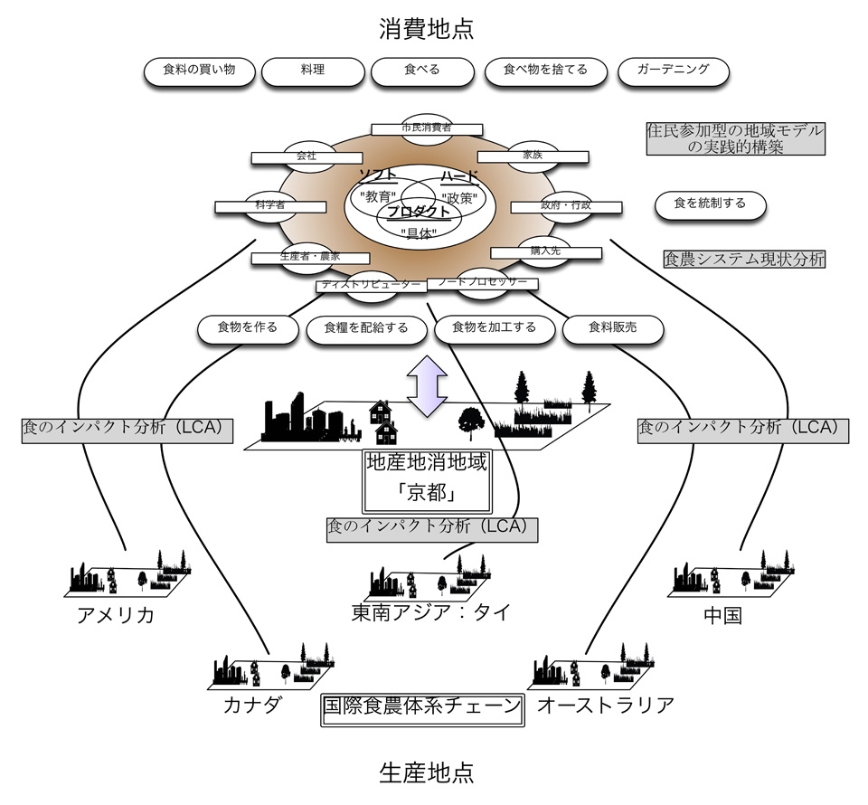 私たちの生活に欠かせない食は、生産、加工、流通、小売、調理の過程をつうじて、環境と深く関わっています。しかし、日本のような先進諸国の食農システムにおいて、消費と生産の距離は遠くなり、中間過程も複雑すぎて見えにくくなっています。この研究では、持続可能な食農システムへの転換を図るために、最終的な決定権をもつ消費場面を焦点として、環境分析やシステム分析を行うだけでなく、住民参加や政策設計などのアクション・リサーチの手法を用いて、成果を社会に埋め込むことをめざします。