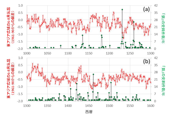 Although we have confirmed tight linkages between climate and Japanese history, this was not the final goal. We can contribute to studies of global environmental issues in two ways besides making science-based predictions of future climate. One is to extract universal lessons from historical climate adaptations. Although past people often got into difficulties when they encountered the enhancement of multi-decadal climate variation, they eventually overcame it by modifying societal systems. We should learn from historical lessons to make new sustainable societies by overcoming difficulties such as enhancement of social inequality due to natural and social environmental changes. Our work also contributes to the issue of faithfully confronting the diversity of past people. As our sense of values is different from those of Pre-Modern people, values of future generations must be different from those of ours. To establish a “futurable” society, one of RIHN’s aims, we should recognize how temporal change and value change are linked, so that we may understand the real sense and meaning of people and societies responses to climate variation.