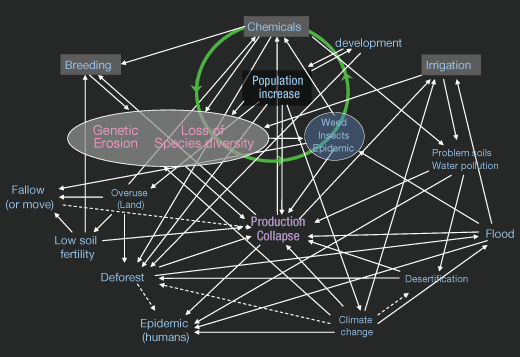 The model indicates that the agricultural collapse is a key element in the Web. Collapse is both a cause and an effect of other events.