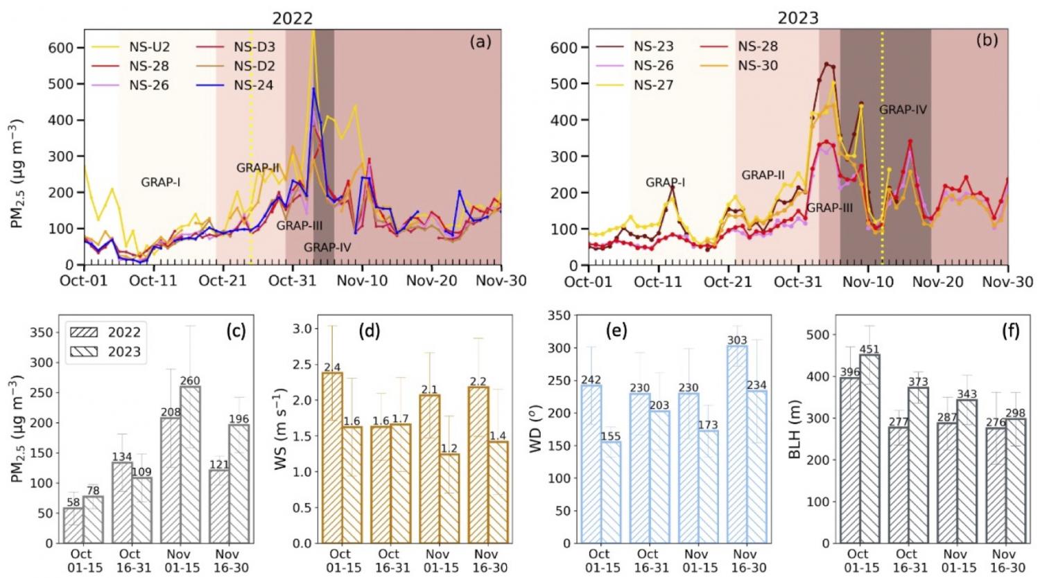 The research findings highlight that, despite a significant reduction in the satellite fire detection counts (FDCs) over Punjab and Haryana from 2015 to 2023, PM2.5 concentrations in Delhi have remained high. The PM2.5 concentrations showed large day-to-day fluctuation from site-to-site in both 2022 and 2023 (Fig. 1). Both years saw significant fire counts in southwest Punjab with daily-mean PM2.5 exceeding 300 μg m–3 in Delhi, but the meteorological conditions were markedly different for the peak CRB days of November 1st – 12th of 2022 and 2023. November 2022 witnessed a prevalence of northwesterly winds allowing the transport of airmass from Punjab and Haryana to Delhi-NCR on two occasions. However, in November 2023, a southwesterly low wind condition with speed <1 m s–1 limited air movement causing an accumulation of local pollutants in Delhi-NCR (Fig. 2). Our analyses showed that the buildup and sustenance of PM2.5 in the Delhi-NCR is primarily of local origin and can be inferred from the rise/drop in concert with implementation/revocation of Graded Response Action Plan (GRAP) stages as administered by the Commission of air quality management (CAQM) (Fig. 2).